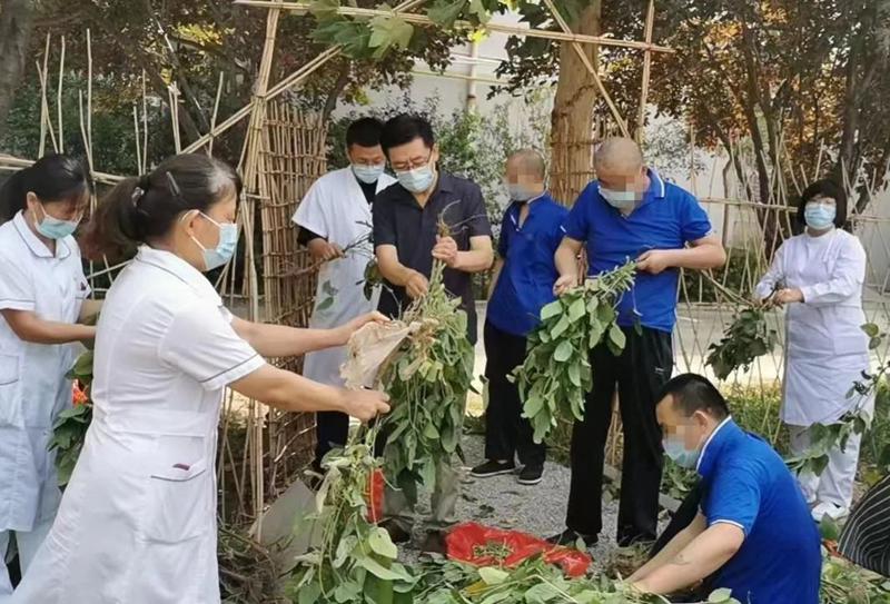 在醫(yī)護人員的陪伴下,在院服務(wù)對象一起走進醫(yī)院康養(yǎng)生態(tài)園,通過勞動進行社會功能恢復(fù)訓(xùn)練。他們有的挎著竹籃掰玉米,有的彎腰收大豆,有的培土、除草……大家沐浴著明媚的陽光,感受著秋天的清爽,在歡聲笑語中體會豐收的喜悅。