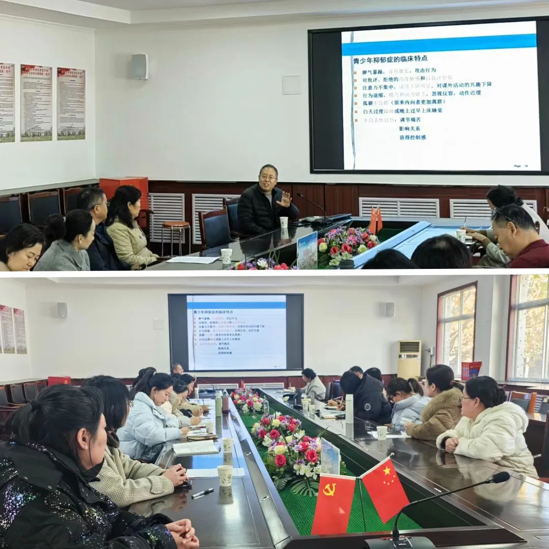 活動中,濱州市優(yōu)撫醫(yī)院心理健康中心主任王力剛以“青少年抑郁癥的早期識別及應(yīng)對策略”為題,憑借專業(yè)的心理學(xué)知識、幽默風(fēng)趣的交流方式,結(jié)合臨床案例,從青少年抑郁癥與成人的區(qū)別、形成原因、臨床上家長為尋求幫助報告的一些典型問題、青少年抑郁癥的臨床特點及應(yīng)對策略等方面,為在場的老師們做了詳細的講解,并鼓勵老師們將所學(xué)的知識運用到實際工作和生活中,積極關(guān)心學(xué)生的心理狀態(tài),切實保障學(xué)生的心理健康。