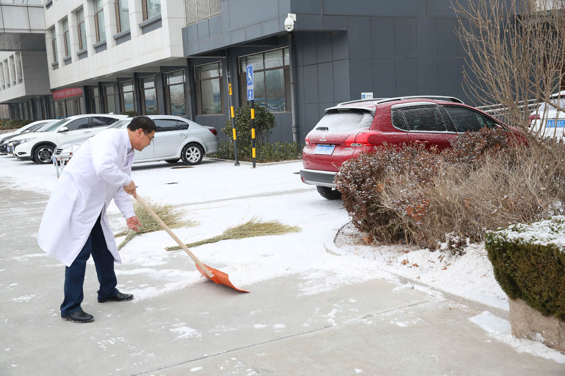 在掃雪現(xiàn)場,大家不畏嚴(yán)寒,相互配合,將積雪鏟起集中堆放,經(jīng)過半小時(shí)的奮戰(zhàn),院內(nèi)道路的積雪全部及時(shí)清掃干凈,臺階處鋪上地毯,確保了職工與就診患者的安全出行。
