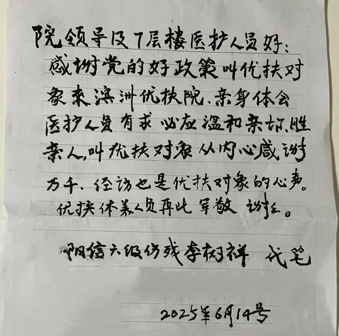 在交流環(huán)節(jié),優(yōu)撫對象程洪全動情回憶了戰(zhàn)場負(fù)傷時的感人瞬間,表達(dá)了對祖國關(guān)切的深深感恩;優(yōu)撫對象李樹祥則以樸實真摯的語言和工整手寫的感謝信,娓娓訴說著對黨和國家的由衷謝意和對醫(yī)院工作的認(rèn)可,令在場所有人深受感動。
