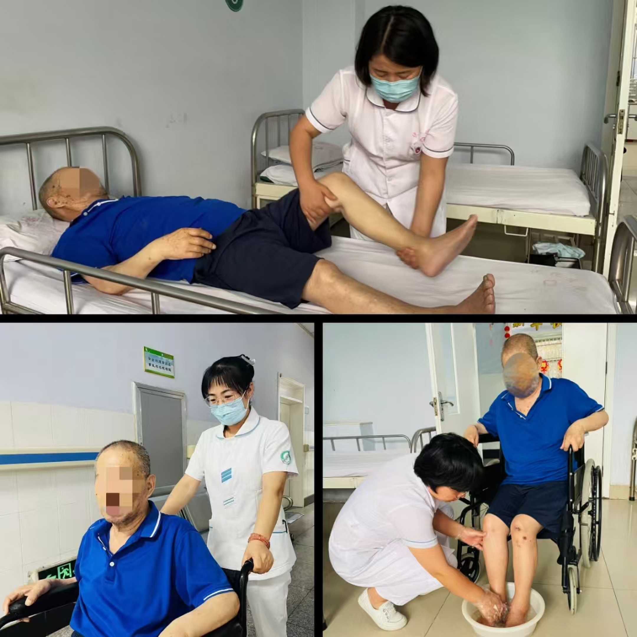 針對這一情況,二病區(qū)醫(yī)療團隊為小貞制定了詳細的治療方案,在采取藥物、物理等治療方式的基礎(chǔ)上,加入按摩、隔物灸等中醫(yī)治療手段,延緩患者的病情發(fā)展。護理團隊也為小貞制定了一套全面細致的護理計劃,護士長王學(xué)雷帶領(lǐng)護理人員幫小貞洗漱、喂飯、活動身體,做到勤更衣、勤洗澡、勤按摩、勤觀察,由于小貞年紀較大,存在表達不暢、溝通困難等問題,需要護理人員時刻關(guān)注他的日常動態(tài),一日三餐按時幫助、及時換衣清潔擦身成為了小貞和護理人員之間最經(jīng)常的互動,從基本生活需求到日常起居,護理人員都會提供事無巨細地暖心服務(wù),注重每一環(huán)節(jié)的護理細節(jié),竭盡所能地減輕小貞的軀體病痛。