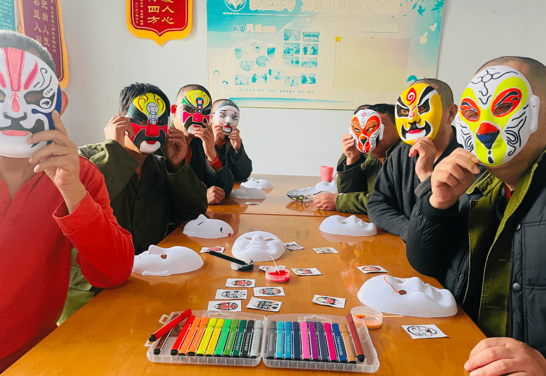 藝術(shù)創(chuàng)作轉(zhuǎn)移患者對(duì)病態(tài)體驗(yàn)的過(guò)度關(guān)注,減少焦慮與抑郁情緒;精細(xì)動(dòng)作訓(xùn)練(如握筆、裁剪)幫助恢復(fù)手部協(xié)調(diào)能力;集體活動(dòng)則重建社交信心:臉譜、書法等傳統(tǒng)文化元素激發(fā)患者對(duì)美的感知,增強(qiáng)文化認(rèn)同感。