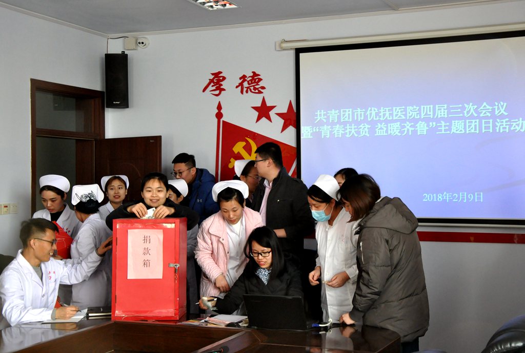 會(huì)后醫(yī)院團(tuán)委組織開(kāi)展了“青春扶貧 益暖齊魯”主題團(tuán)日活動(dòng)。20余名團(tuán)員現(xiàn)場(chǎng)踴躍捐款,共為貧困孤殘兒童捐款1000余元。