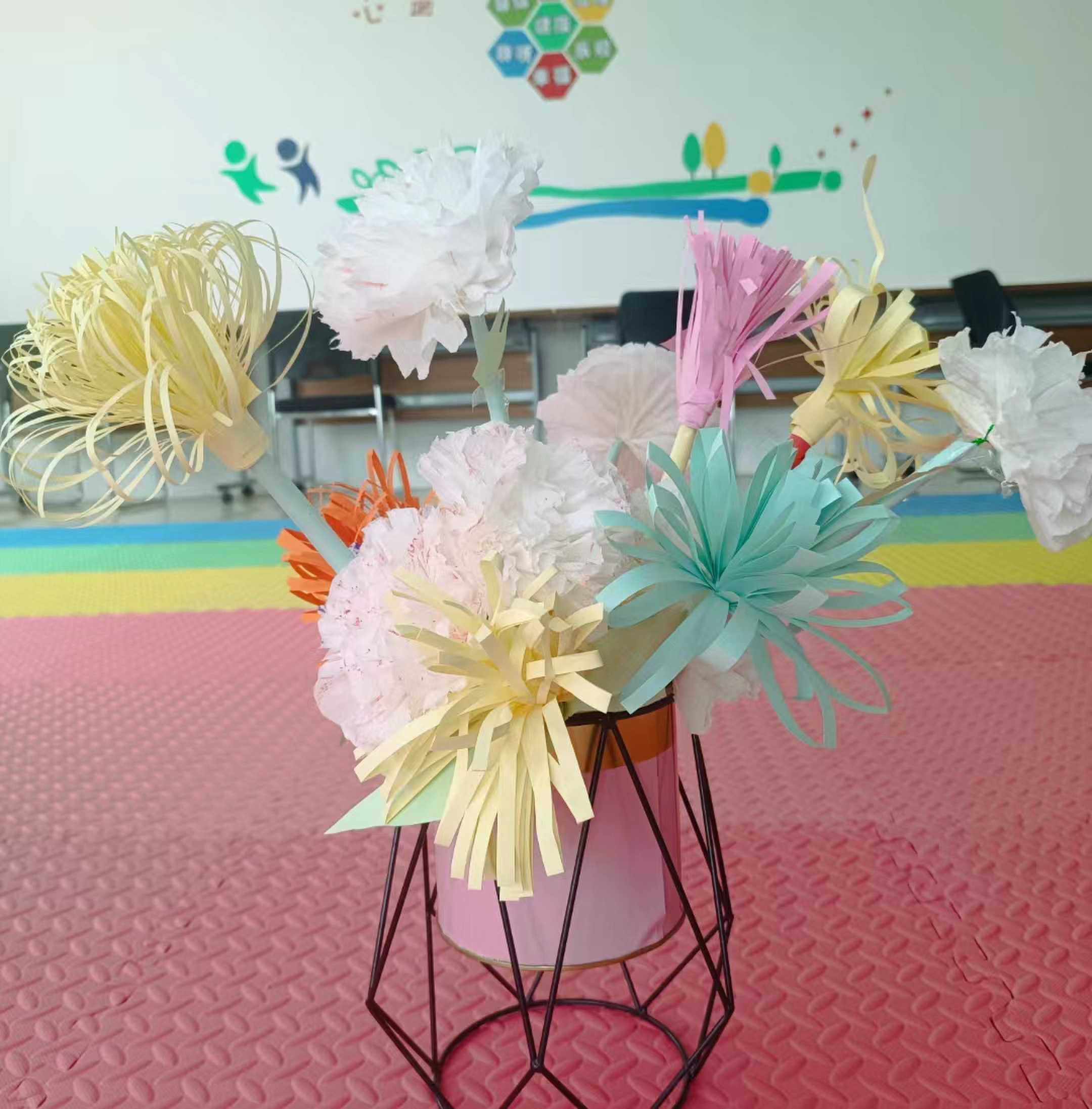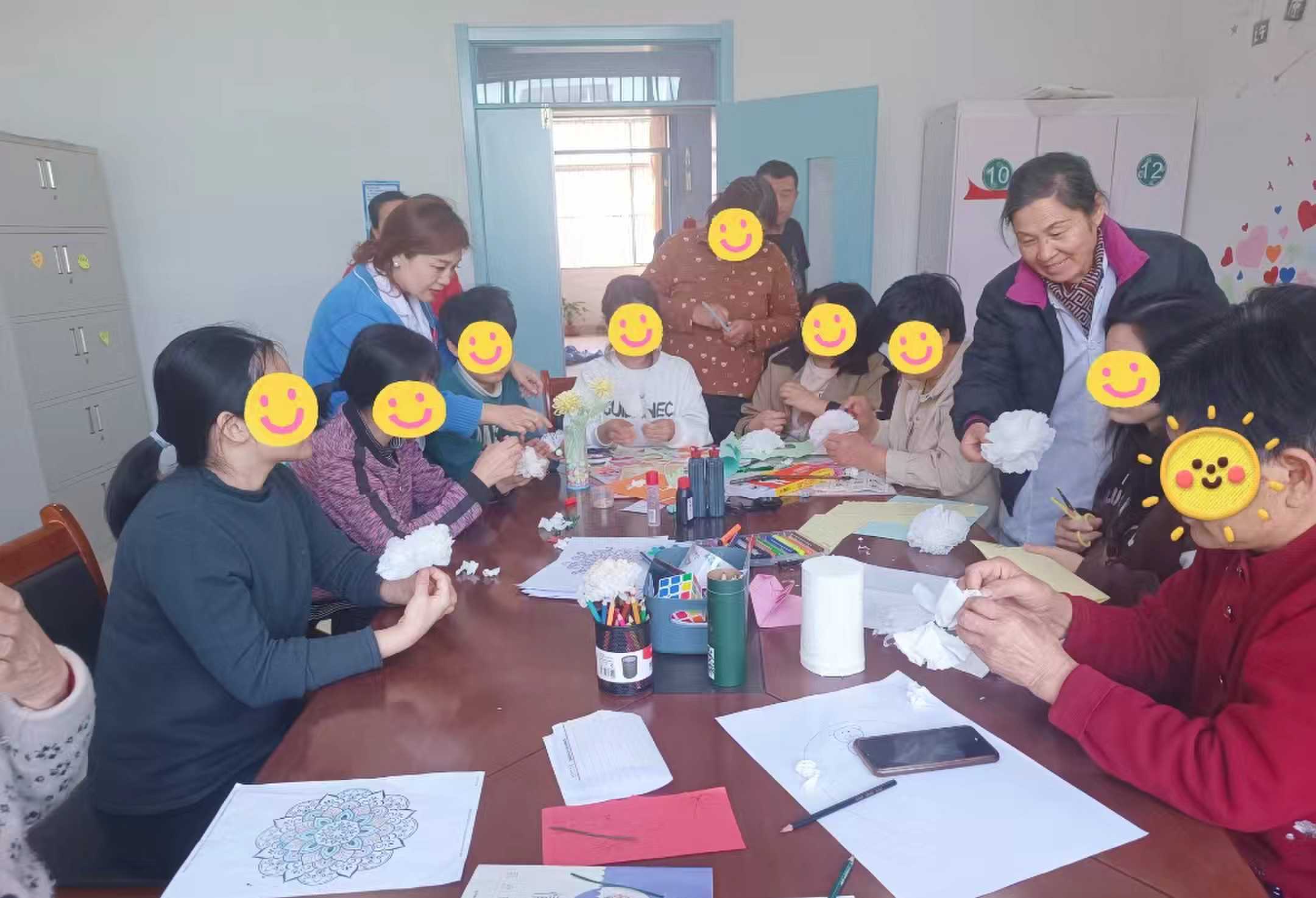 活動分為手工制作和故事分享兩個環(huán)節(jié)。首先,在醫(yī)護人員的細心指導(dǎo)下,患者們用畫筆、彩色卡紙,制作出了各種各樣的手工作品,有代表懷念和哀悼的菊花花束、還有色彩鮮明的“清明圖”,患者們用這種特別的方式遙寄思念、文明祭祀。