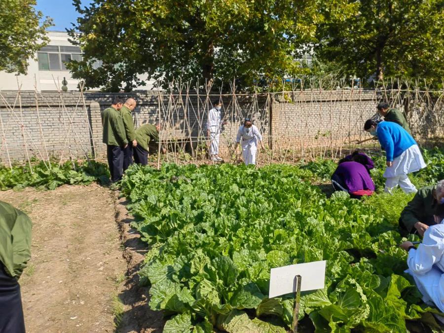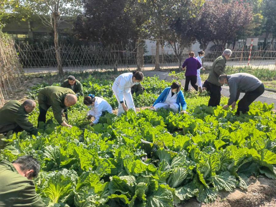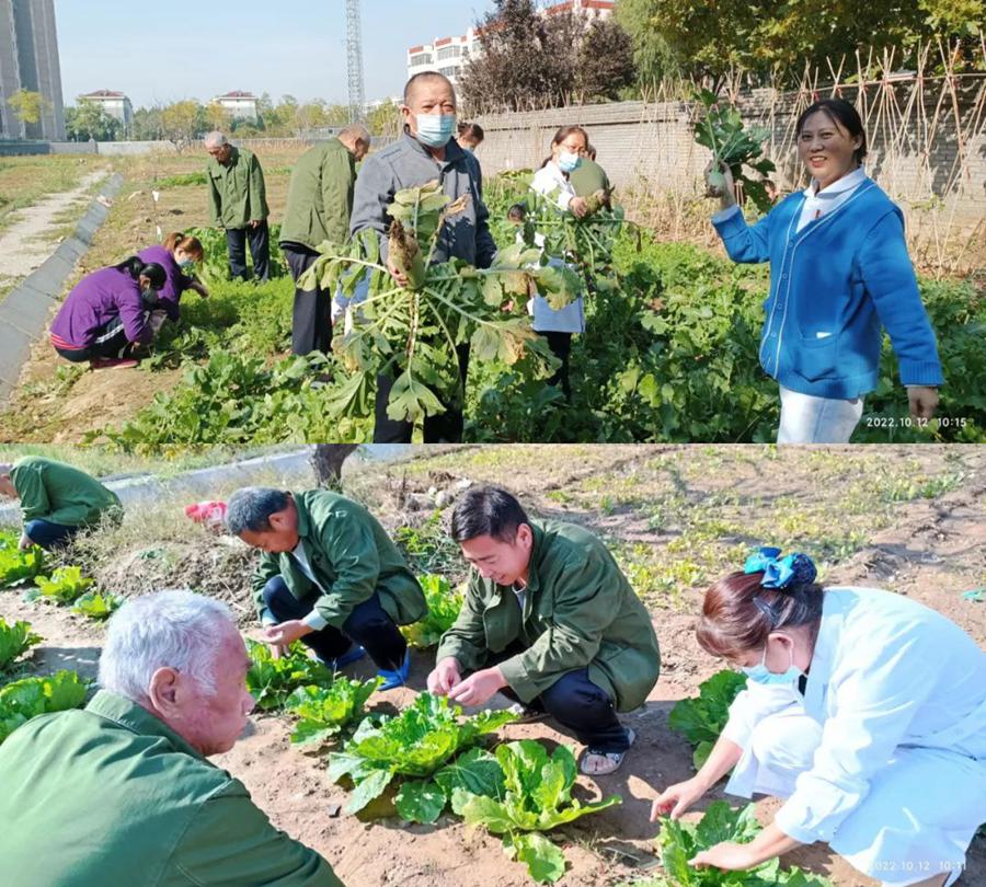 康養(yǎng)生態(tài)園內(nèi),住院服務(wù)對象有的拔蘿卜,有的給大白菜除蟲,還有的在醫(yī)護(hù)人員的指導(dǎo)下翻地、鋤草、分菜畦……大家沐浴著明媚的陽光,感受著秋天的清爽,在歡聲笑語中體會勞動和收獲的喜悅,現(xiàn)場氣氛活躍,不時傳來歡聲笑語。
