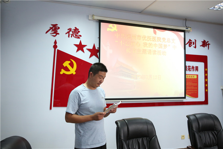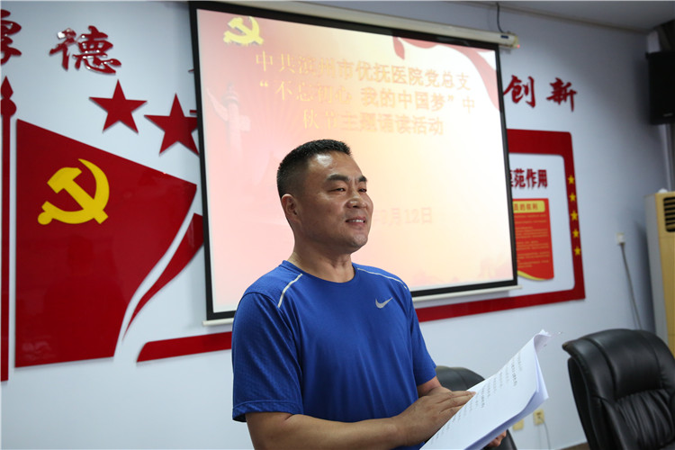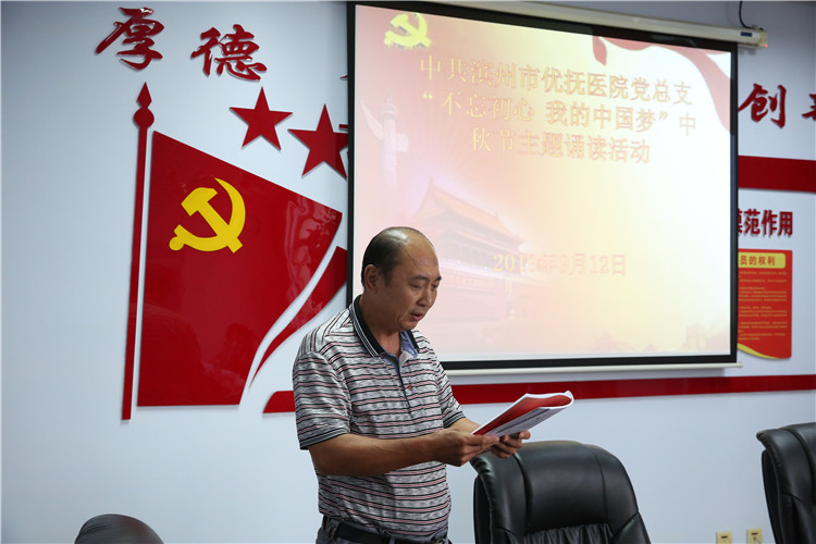 活動(dòng)中,黨員們聲情并茂地朗誦了《高山流水》、《水調(diào)歌頭·明月幾時(shí)有》、《關(guān)山月》等古今廣為流傳的中秋經(jīng)典。精彩的誦讀博得現(xiàn)場(chǎng)陣陣掌聲,讓與會(huì)黨員受到了一次中華優(yōu)秀傳統(tǒng)文化的熏陶和洗禮。最后,院長牛希國同志現(xiàn)場(chǎng)賦《不忘初心,我的事業(yè)夢(mèng)》,用真摯的感情抒發(fā)了對(duì)團(tuán)圓和諧的贊美,對(duì)新中國成立70周年的祝福,對(duì)我院精神??坪宛B(yǎng)老事業(yè)齊頭并進(jìn)同發(fā)展的決心,引起了大家的強(qiáng)烈共鳴。