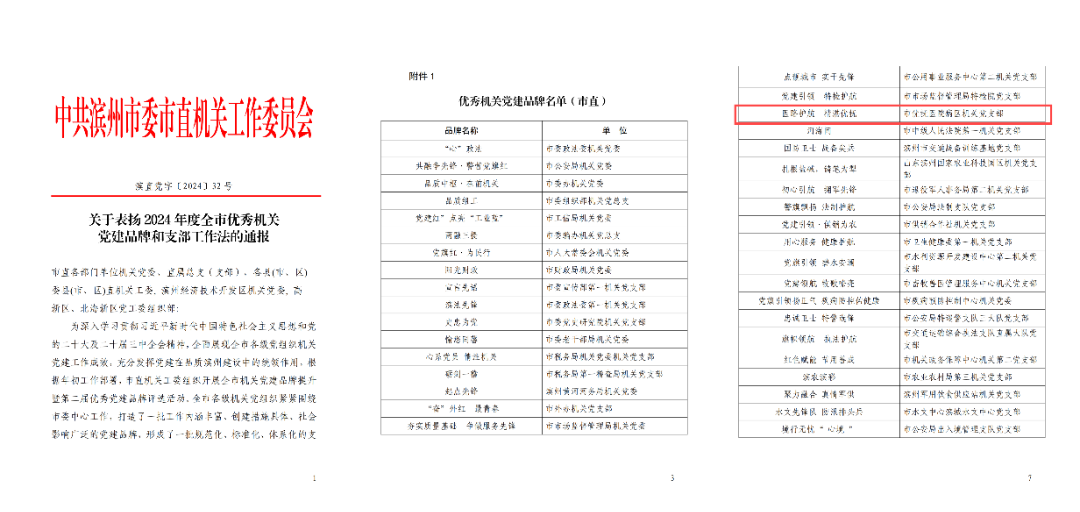 12月11日,中共濱州市委市直機關工作委員會發(fā)布了《關于表揚2024年度全市優(yōu)秀機關黨建品牌和支部工作法的通報》,濱州市優(yōu)撫醫(yī)院病區(qū)黨支部“醫(yī)路護航 精湛優(yōu)撫”品牌被評為“優(yōu)秀機關黨建品牌”。