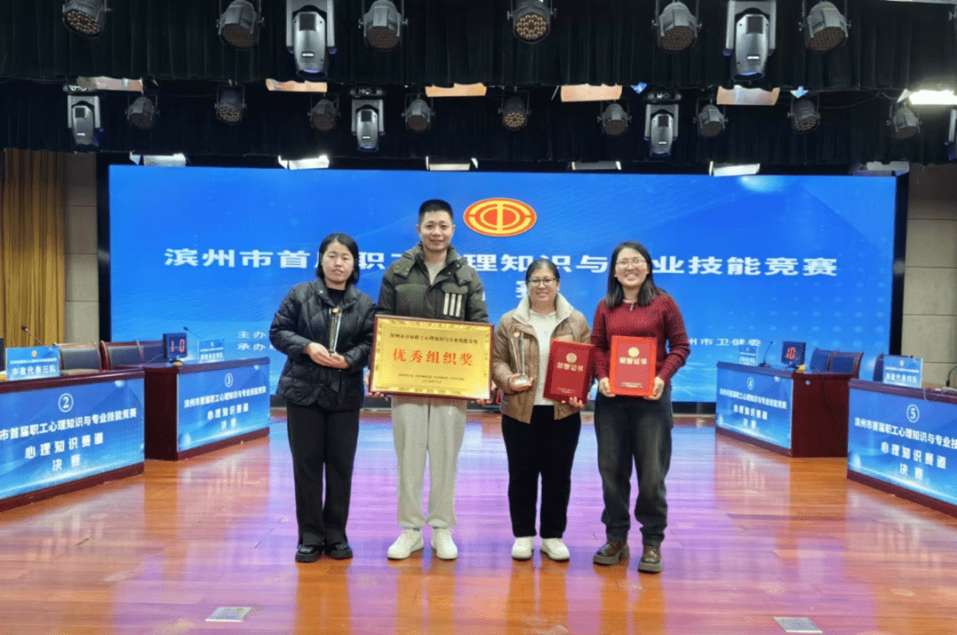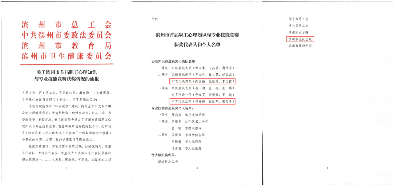 近日,由市總工會(huì)聯(lián)合市委政法委、市教育局、市衛(wèi)健委共同舉辦的“濱州市首屆職工心理知識(shí)與專業(yè)技能競(jìng)賽”在市工人文化宮舉行。經(jīng)過(guò)初賽選拔,我院職工高國(guó)強(qiáng)、李文霞、崔春梅、張延芹入圍決賽并榮獲佳績(jī)。