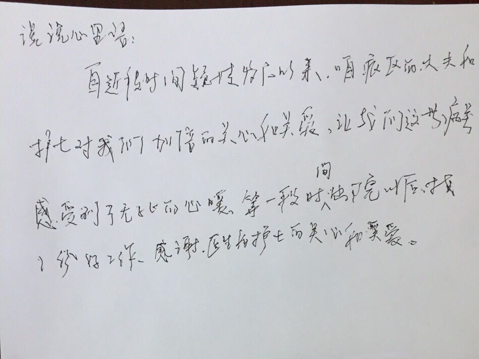 他們發(fā)自肺腑訴說著藏在內(nèi)心深處的感恩與憧憬。有的人寫給他年邁的父親;有的人寫給未來的自己;有的人寫給即將成家立業(yè)的兒女;有的人寫給我們醫(yī)護(hù)人員!他們嘴上雖然不說,不善于表達(dá)內(nèi)心的想法,但是字里行間透露著一股濃濃感恩之情!